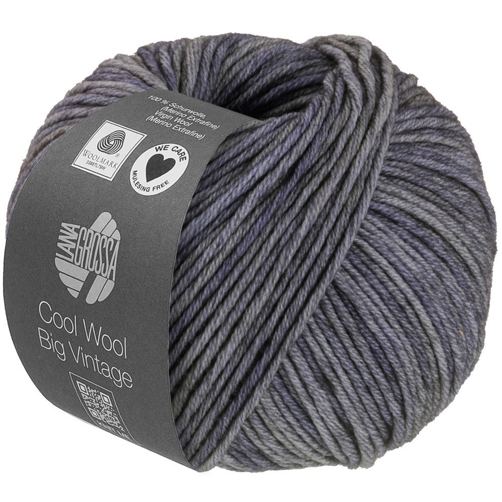 Lana Grossa Cool Wool Big Vintage er et klassisk merinogarn med en tone-i-tone farveeffekt, der består af 100% ren ny merinould. Garnet har samme kvalitet som Cool Wool Vintage, men er en tykkere variant, hvilket giver et fyldigere udtryk.