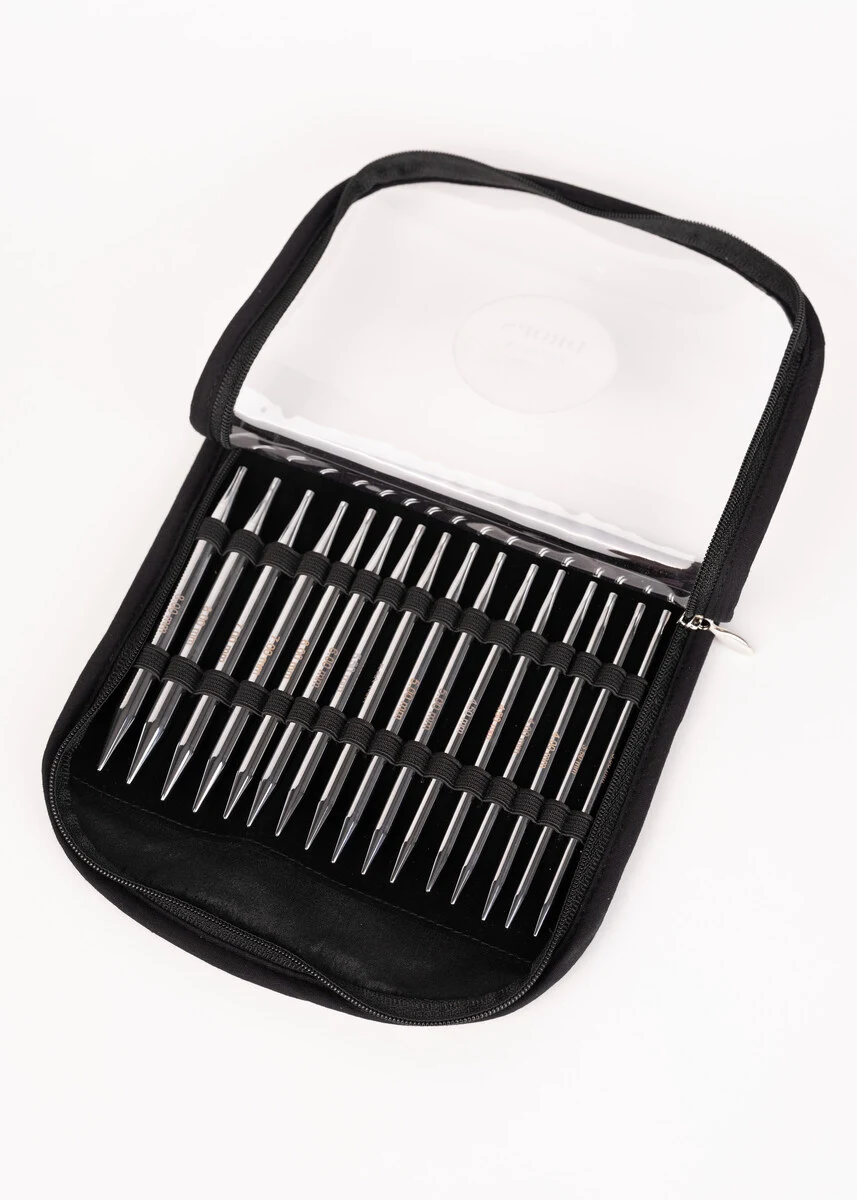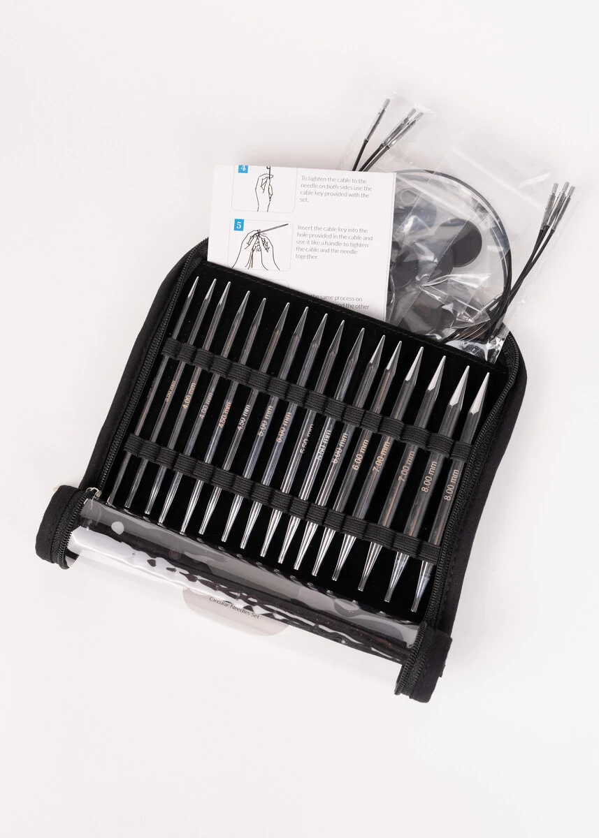 Sættet leveres i et praktisk tekstiletui med gennemsigtig vinylfront, så du nemt kan holde overblik over dine pinde og tilbehør. De udskiftelige pinde skrues nemt fast på kablerne, så du kan kombinere forskellige størrelser og længder alt efter dit projekt.