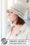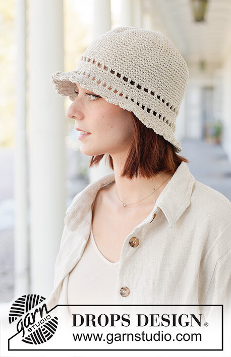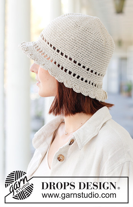 Hæklet hat i DROPS Bomull-Lin. Arbejdet hækles oppefra og ned i fastmasker med hullborter og kant i viftemønster.