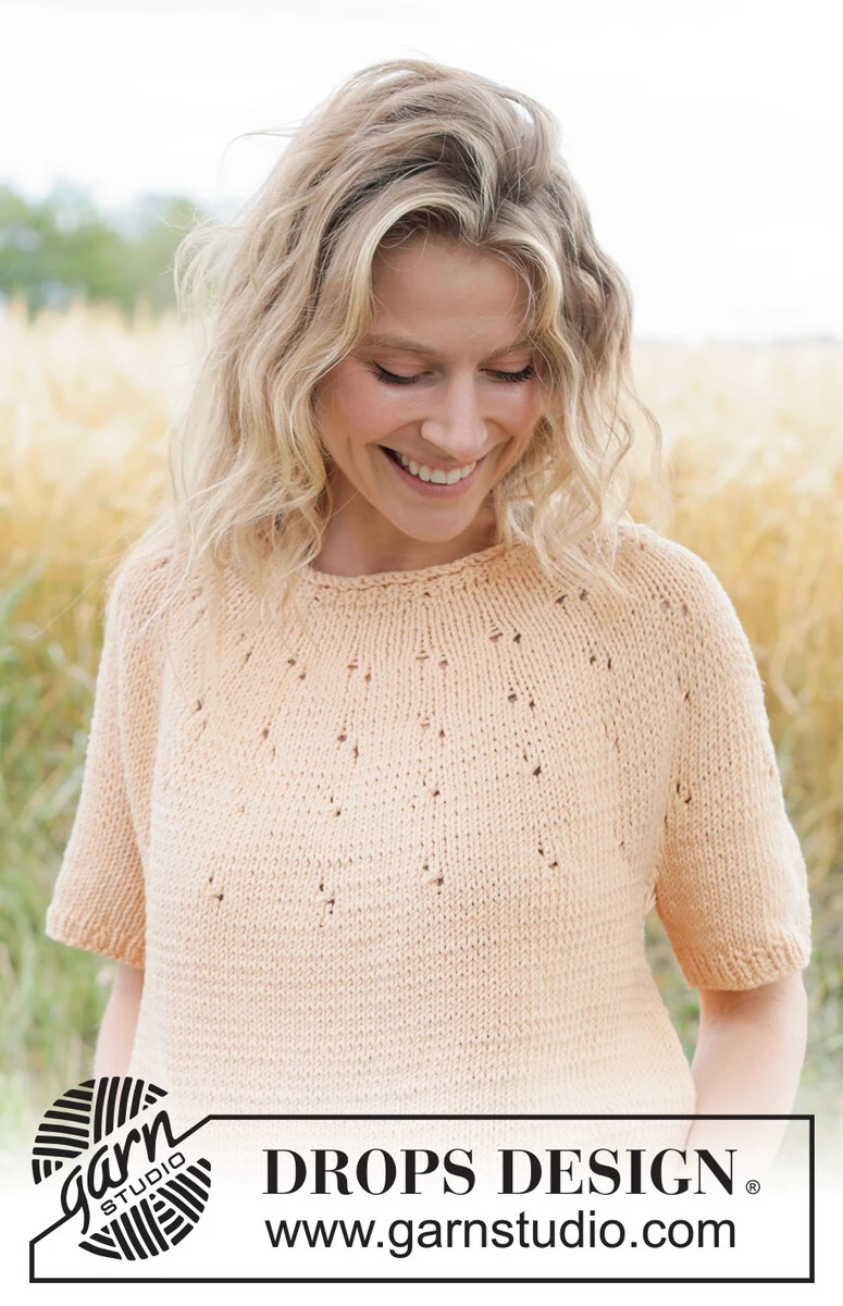 Strikket bluse med korte ærmer i DROPS Paris. Arbejdet strikkes oppefra og ned med rullekant, rundt bærestykke og hulmønster på bærestykke. Størrelse XS - XXXL.