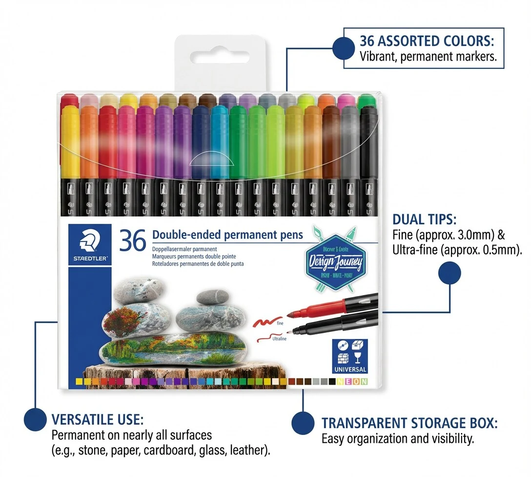 Med STAEDTLER® 3187 får du et alsidigt sæt permanente dobbelttuscher, der dækker både hurtige markeringer og kreativ detaljering. To spidser pr. pen giver høj funktionalitet, og de 36 farver giver masser af muligheder for at variere udtryk. Når du vil have tydelige streger og et sæt, der kan bruges på mange overflader, er dette et sikkert valg til dit næste projekt.